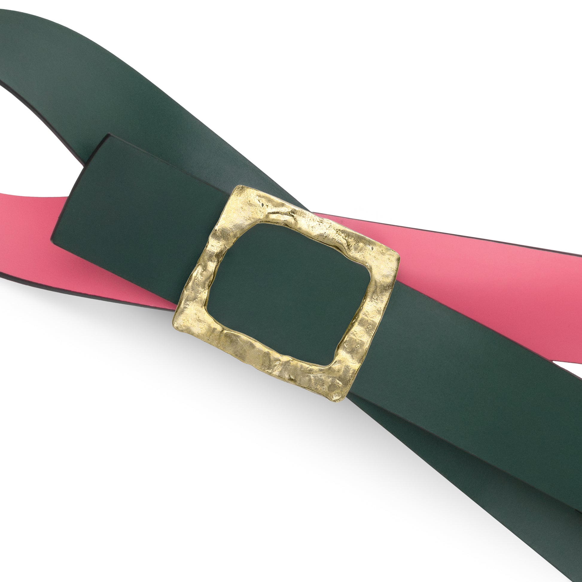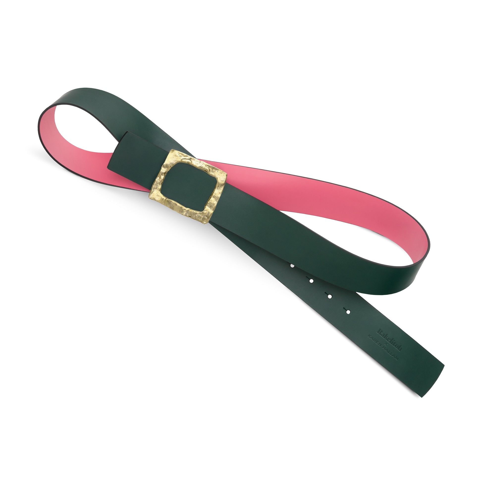 CINTURÓN ROSA - VERDE BOTELLA REVERSIBLE 42 mm / HEBILLA GRANDE LATÓN
